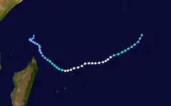 For several days in mid-December, tropical cyclone forecast models anticipated a storm to form to the south-west of Diego Garcia, which was proven true when an area of convection formed in that area,[7] becoming a tropical disturbance on December 21,[17] the fourth of the season. On December 23, MFR upgraded the disturbance to a tropical depression, and later that day to Tropical Storm Crystal. The storm moved southwestward toward Mauritius due to a ridge to the south-east.[7] Strengthening was gradual, and the JTWC upgraded Crystal to the equivalent of a minimal hurricane late on December 24.[17] The next day, an eye developed, although dry air initially prevented much further intensification.[7] MFR upgraded Crystal to tropical cyclone status on December 26,[17] and that day the cyclone passed just east of St. Brandon. Subsequently, Crystal intensified quickly after the eye became clearer,[7] reaching peak winds of 150 km/h (93 mph) on December 27.[17] Around that time, the storm passed east of Mauritius as it turned to the south while rounding the ridge.[7] After maintaining peak winds for about 18 hours, Crystal weakened,[17] gradually undergoing extratropical transition. The convection diminished over the center,[7] and Crystal weakened to tropical storm status on December 28.[17] The next day, the JTWC and MFR discontinued advisories, labeling the storm as extratropical.[7] The remnants continued to the south-east, dissipating on January 3 after crossing into the Australian region.[17]