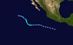 Due to its strong intensity, Elida produced high waves that affected the Mexican coastline.[31] After its peak, the hurricane began to weaken in an irregular fashion. After the inner eyewall dissolved, the intensity of the hurricane decreased to a low-level Category 3 storm, with winds of 120 mph (190 km/h).[40] By this time, Elida had reached the edge of the ridge that kept the cyclone from turning northwest, and a turn to the northwest was beginning. The hurricane proceeded to undergo another eyewall replacement cycle, lowering its intensity to Category 2 intensity.[41] Late on July 26, the eye disappeared from satellite.[42] The weakening trend continued, and Elida weakened to a tropical storm on July 27.[31] At this time, a weakness in the subtropical ridge allowed the storm to make a turn towards the north.[43] Early on July 28, Elida began redeveloping, regaining moderate convection and possibly reintensifying,[44] but eventually, the storm weakened back into a depression early on July 29.[45] On the next day, Elida degenerated into a remnant low, and the last advisory was issued while an area of convection was displaced to the north of the center, with 12-foot (3.7 m) seas in the area.[46] The center was 805 mi (1,296 km) from Punta Eugenia, Mexico when the last advisory was issued.[47] The remnant low of Elida moved northeast and eventually dissipated on July 31, 535 mi (861 km) west of Los Angeles, California.[31]