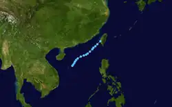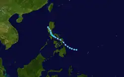 On March 15, the JTWC began monitoring a tropical disturbance, and four days later upgraded it to a tropical depression near Palau.[11][21] The next day, both the JMA and PAGASA classified the system as a depression, and PAGASA named it "Caloy".[23] Moving west-northwestward due to a ridge to the north,[11] the depression moved across the Philippine island of Mindanao on March 21 and continued through the archipelago.[21] Owing to strong wind shear, the system never intensified,[11] and the JMA discontinued advisories on March 23 after the system reached the South China Sea.[23] The JTWC maintained the system as a tropical depression until March 25, when a mid-latitude trough absorbed the system off the east coast of Vietnam.[11]