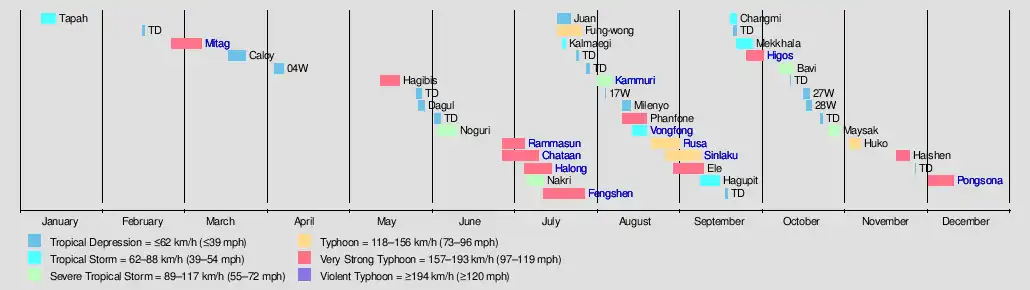 The activity was an active season, with many tropical cyclones affecting Japan and China. Every month had tropical activity, with most storms forming from July through October. Overall, there were 44 tropical depressions declared officially or unofficially, of which 26 became named storms; of those, there were 15 typhoons, which is the equivalent of a minimal hurricane, while 8 of the 15 typhoon intensified into super typhoons unofficially by the JTWC. The season began early with the first storm, Tapah, developing on January 10, east of the Philippines. Two months later, Typhoon Mitag became the first super typhoon [nb 3] ever to be recorded in March. In June, Typhoon Chataan dropped heavy rainfall in the Federated States of Micronesia, killing 48 people and becoming the deadliest natural disaster in the state of Chuuk. Chataan later left heavy damage in Guam before striking Japan. In August, Typhoon Rusa became the deadliest typhoon in South Korea in 43 years, causing 238 deaths and $4.2 billion in damage.[nb 4] Typhoon Higos in October was the fifth strongest typhoon to strike Tokyo since World War II. The final typhoon of the season was Typhoon Pongsona, which was one of the costliest storms on record in Guam; it did damage worth $700 million on the island before dissipating on December 11.
