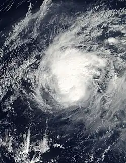 The monsoon trough spawned a tropical disturbance near the Caroline Islands in mid-May.[11] By that time, the system was an area of convection with a weak circulation, although the system organized as outflow improved. It tracked northwestward within the monsoon trough,[26] steered by a mid-level ridge.[11] The system developed into a tropical depression on May 14 about 500 km (310 mi) southwest of Chuuk Lagoon,[10] and early the next day the JTWC initiated advisories.[11] For several days the depression remained weak, until it intensified into a tropical storm named "Hagibis" on May 16, about 200 km (120 mi) southwest of Guam.[10] The developing storm dropped rainfall on Guam that ended the island's wildfire season.[27] The storm quickly intensified, developing an eye feature later that day.[26] Early on May 18, the JMA upgraded Hagibis into a typhoon,[10] and around that time, an approaching trough turned the storm to the northeast.[26]