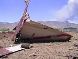 Lockheed C-130A Hercules registration N130HP, call sign Tanker 130, was flying against the Cannon Fire,[2] near Walker, California on June 17, 2002, when it experienced structural failure of the center wing section, causing both wings to fold upward and separate from the aircraft. The fuselage rolled and crashed inverted, killing the three crewmen on board.[3][4][5] Unusually, the aircraft was being filmed by a passing tourist during the retardant drop and at the moment the wings separated,[6] providing valuable video evidence for the subsequent investigation by the National Transportation Safety Board (NTSB).