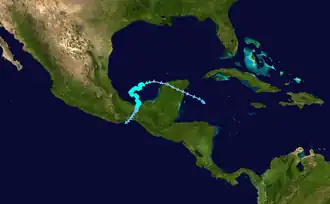 A well-organized tropical wave tracked quickly through the Lesser Antilles on July 7, producing tropical storm force winds but failing to attain a low-level circulation. After organizing in the Caribbean, it developed into Tropical Storm Claudette to the south of the Dominican Republic on July 8. Its intensity fluctuated over the subsequent days, attaining hurricane status briefly on July 10 before weakening and hitting Puerto Morelos on the Yucatán Peninsula on July 11 as a tropical storm. The storm remained disorganized due to moderate wind shear, though after turning west-northwestward into an area of lighter shear, it re-attained hurricane status on July 15 off the coast of Texas; it intensified quickly and made landfall on Matagorda Island with peak winds of 90 mph (140 km/h). It slowly weakened after moving ashore, tracking across northern Tamaulipas before dissipating in northwestern Chihuahua.[17]