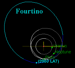 2003 LA7, is a resonant trans-Neptunian object that goes around the Sun once for every four times that Neptune goes around. This means it is in a 1:4 orbital resonance with Neptune. Another example of such object in this resonance is 2011 UP411.