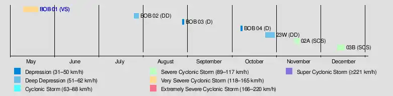 There were seven depressions throughout the season, of which three attained cyclonic storm status. One of the cyclonic storms formed before the start of the monsoon season, two depressions formed during the monsoon season from June to September, and the remaining systems formed after September.[1] The number of depressions was similar or greater than that of the previous three years.[2] However, the total of 3 cyclonic storms was below the average of 5.4.[3]