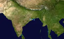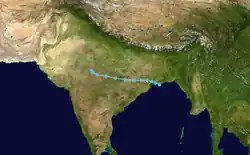 A low pressure area persisted over the northern Bay of Bengal on July 22, eventually organizing into a depression on July 25 about 160 km (99 mi) south of Kolkata. Moving northwestward, the system quickly intensified into a deep depression,[1] with peak winds estimated at 55 km/h (35 mph). Late on July 25, the system made landfall north of Balasore in Odisha state.[18] It progressed inland across India, weakening to depression status but remaining a distinct system. On July 28, the depression degenerated into a remnant low over Rajasthan in northwestern India, later merging with a heat low. Rainfall associated with the system mostly occurred in the southwestern periphery, with a peak of 250 mm (9.8 in) at Kendrapara; there was little damage.[1] Rainfall also spread into Bangladesh.[2]