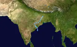 A low-pressure area persisted on October 4 in the western Bay of Bengal, off the east coast of Tamil Nadu. Two days later, the system organized into a depression and moved northward. Early on October 7, the depression made landfall at Kalingapatnam, Andhra Pradesh. After moving slowly northwestward over land, the system turned to the northeast, degenerating into a remnant low on October 10 over West Bengal.[1] The depression dropped heavy rainfall along its path, peaking at 380 mm (15 in) in Chandabali, Odisha. Kolkata received 267 mm (10.5 in), and rainfall spread as far northeast as Assam.[20] The rains caused widespread flooding across southeastern India, inundating 20 villages and covering 16,000 hectares (39,000 acres) of rice paddies. A tornado spawned by the depression injured 11 people and damaged several houses in Murshidabad. Across its track, the depression killed 13 people in West Bengal and another eight in Andhra Pradesh.[1]