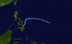 A tropical disturbance persisted in the monsoon trough northwest of Pohnpei on June 7, and moved westward without development due to wind shear.[18] On June 11, the shear decreased enough to allow the convection to organize,[13][18] and the next day the JMA classified it as a tropical depression northeast of Palau. On June 13, the JMA upgraded it to Tropical Storm Soudelor to the east of the Philippines,[12] and PAGASA gave it the local name "Egay".[50] Soudelor moved to the northwest and later to the north, parallel to the eastern Philippines, and on June 17, the JMA upgraded it to typhoon status.[12] The storm rapidly intensified to the east of Taiwan as it developed a well-defined eye,[18] and while doing so passed over the Japanese island of Iriomote-jima at around 2030 UTC on June 17.[12] At 0600 UTC on June 18, the JTWC estimated peak 1 minute winds of 215 km/h (134 mph),[13] while the JMA estimated peak 10 minute winds of 150 km/h (93 mph).[12] Increased shear weakened the typhoon to tropical storm strengthen on June 19, and later that day the JMA declared the storm as extratropical near the Oki Islands. The extratropical remnants of Soudelor continued to the northeast, crossing northern Japan on June 20 and dissipating on June 24.[12]