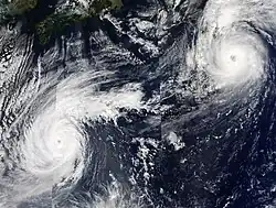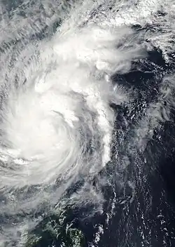 Activity was somewhat below average in September, with only one tropical cyclone making landfall, Maemi.[12][23] However, Maemi was the strongest tropical cyclone of the season and was the costliest with roughly US$4.8 billion in damage, mostly in South Korea.[24] Tropical cyclogenesis and activity continued to decline after August, with October featuring only three tropical storms. However, two, Ketsana and Parma, reached typhoon intensity; both stayed away from land.[25][26] November featured less storms but was climatologically average, with two typhoons developing.[27] The second typhoon, Lupit, devastated portions of Yap State, resulting in approximately $1.7 million in damage.[28] In December, the JTWC and PAGASA monitored a sole tropical system east of the Philippines, though the JMA did not monitor or classify any tropical cyclones during the month.[29]