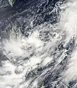 An area of convection formed on May 16 to the southwest of Palau, located within an area of weak wind shear. The next day, the JMA and the JTWC both classified the system as a tropical depression. The convection was disorganized in association with multiple circulation centers, although it gradually organized. Moving westward initially, the depression turned more to the north into an area of increasing wind shear. On May 19, the JTWC upgraded the system to Tropical Storm 03W,[1] and on the same day, PAGASA classified it as Tropical Depression Batibot.[39] Soon after, the convection decreased from the center, and by May 20, all warning agencies had discontinued advisories.[1]