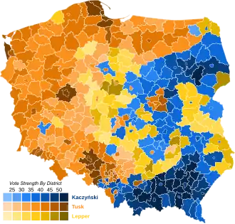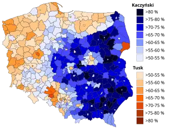 Two center-right candidates, Donald Tusk, chairman of the Civic Platform (PO) and Deputy Marshal of the Sejm, and Lech Kaczyński, honorary chairman of Law and Justice (PiS) and mayor of Warsaw, led the poll in the first round, as was widely expected. As neither received 50 percent of the vote, a second-round was held on 23 October. In this round, Kaczyński defeated Tusk, polling 54.04 percent of the vote.