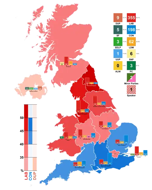 At 04:28 BST, it was announced that Labour had won Corby, giving them 324 seats in the House of Commons out of those then declared and an overall majority, Labour's total reaching 355 seats out of the 646 House of Commons seats. Labour received 35.3% of the popular vote, equating to approximately 22% of the electorate on a 61.3% turnout, up from 59.4% turnout in 2001.[15]