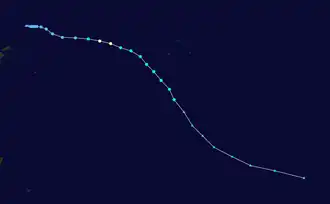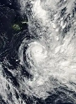 The FMS subsequently estimated during October 24, that the system had peaked as a Category 4 Severe Tropical Cyclone with 10-minute sustained wind speeds of 175 km/h (110 mph), while it was located about 220 km (135 mi) to the east of Vanua Lava in northern Vanuatu.[5][6] The JTWC also estimated during October 24, that the system had peaked with 1-minute sustained wind speeds of 215 km/h (135 mph), which made it equivalent to a category 4 hurricane on the Saffir-Simpson hurricane wind scale.[7] Over the next day the system maintained its peak intensity as it moved south-eastwards, before it turned westwards during the next day towards Vanuatu and rapidly weakened after it moved into an area of cooler sea-surface temperatures and strong vertical wind-shear.[5][6][10] As a result, during October 26, The FMS and JTWC both reported that the system had weakened into a tropical depression, before the systems remnants were last noted by the FMS during October 28.[5][12] On the Santa-Cruz Islands of Utupua and Vanikolo some minor tree damage was reported, while extensive damage to food crops occurred at Tikopia.[5][10] However, Radio New Zealand reported that overall damage at Tikopia was considered to be light given the circumstances.[10] Strong and gusty winds, rough seas and moderate to heavy swells were reported within the eastern Vanuatuan islands, however, no significant damage was reported within the islands.[5][10]