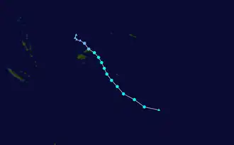 Late on November 16 a weak tropical disturbance formed to the north-west of Tuvalu embedded within the South Pacific Convergence Zone.[5][19] The disturbance did not have any organised convection near the low level circulation centre and was located in an area of low vertical wind shear.[19] Early the next day whilst the organisation of the system had not improved much, there had been enough of an increase in convection in the northern and southern quadrants for RSMC Nadi to designate the disturbance as Tropical Depression 04F.[20] Over the next couple of days the depression gradually moved towards the south-west before the low level circulation center was relocated to the north of Vanuatu early on November 19.[21][22] The depression continued to gradually develop, with a Tropical Cyclone Formation Alert being issued late on November 21 as convection had erupted about the low level circulation centre with bands of convection wrapping around the low level circulation significantly.[5][23][24][25]