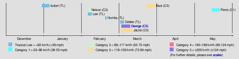 | Odette | 2 – 5 March | Tropical low | 75 km/h (45 mph) | 990 hPa (29.23 inHg) | None | None | ||