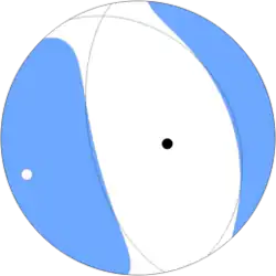 The focal mechanism of the earthquake is consistent with normal faulting on a westerly dipping fault plane. Field investigations identified 15 km of surface rupture in the form of a west-facing scarp, with up to 2.05 m of vertical displacement, although it was not possible to prove the full extent of surface faulting due to lack of time and the presence of minefields.[4] Investigations using Interferometric synthetic aperture radar (InSAR), combined with field and seismological observations, have identified two fault segments with slightly differing strikes, with the hypocenter and most of the displacement being on the more southerly of the segments.[7]