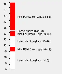 An effective strategy from the BMW Sauber team benefited Robert Kubica, who was propelled into the lead after the Hamilton incident. It was short-lived, however, because after one lap, a hydraulics failure deprived him and the BMW Sauber team of a potential first victory each. This left Räikkönen leading from Alonso, who had overtaken Massa in the pitstops, and Jenson Button.