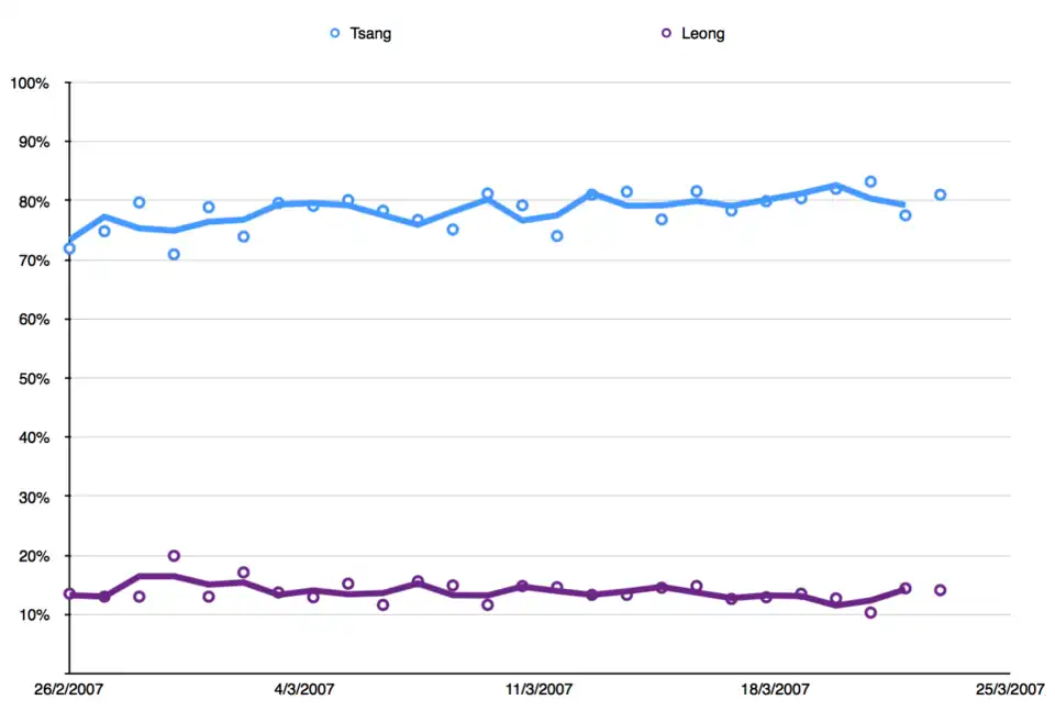 Donald Tsang dominated in the polls despite his relative inactivity and lack of eloquence in public debate. Alan Leong never achieved a rating higher than 20 percent in the rolling opinion polls conducted by the Hong Kong University Public Opinion Programme between 26 February and 23 March.