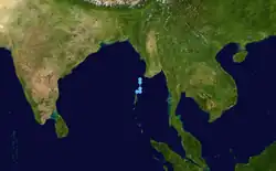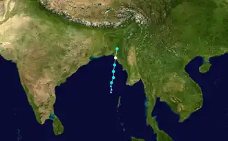 An area of disturbed weather first formed east of the Malay Peninsula on April 26. It slowly consolidated, and the Thai Meteorological Department (TMD) designated the active low pressure area as a tropical depression on May 1 in the Gulf of Thailand.[2] Moving westwards, it made landfall in the coastal areas of Chumphon, and then moved into the Andaman Sea.[3] The system strengthened slightly, and late on May 3, the India Meteorological Department (IMD) designated it as a depression. It then began to move northwards, and in the morning of May 5, it made a second landfall on the coast of Rakhine State in Myanmar. The system weakened into an area of low pressure shortly after, and the IMD issued its last bulletin.