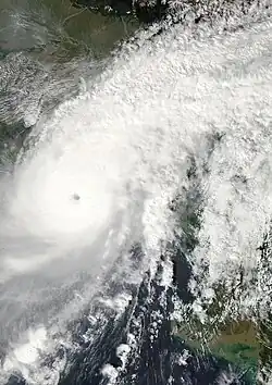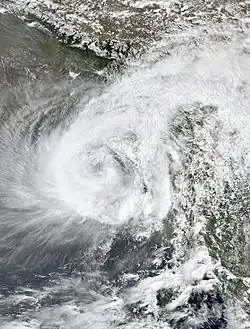 The deep depression made landfall near Kakinda early on June 22 local time.[20] The JTWC issued its final advisory later, as the system began to weaken due to land interaction and wind shear.[21] The next day, the IMD downgraded it to a depression while it crossed the Deccan Plateau.[22] The final warning was issued on June 24, despite the storm having moved into the Arabian Sea. The storm killed at least 140 people in India,[23] and another 213 people died in Karachi, Pakistan from rains and winds that might have been associated with an outer band of the cyclone.[24] The Pakistan Meteorological Department (PMD) had warned of heavy rains and wind from the system as early as Friday June 22.[25]