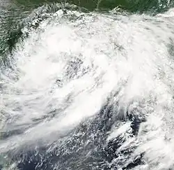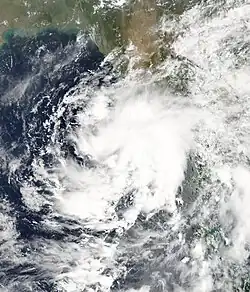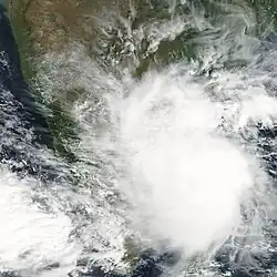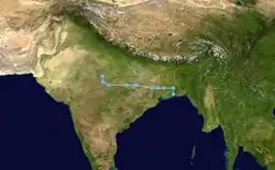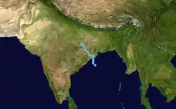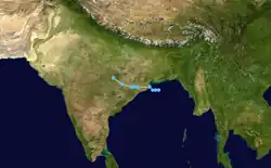 On June 28, an area of disturbed weather in the Bay of Bengal that had persisted as a well-marked low pressure area for two days became more organised.[42] The India Meteorological Department (IMD) noted the formation of a depression around 0000 UTC (5:30 am IST) southeast of Puri, Orissa, India. The IMD also stated that the system intensified into a deep depression three hours later whilst remaining "practically stationary".[43] The Joint Typhoon Warning Center (JTWC) issued a Tropical Cyclone Formation Alert shortly after, noting that observations from the eastern coast of India had recorded falls in pressure corresponding with the system's development. Furthermore, an upper-level anticyclone had formed over the disturbance, which would maintain the favourable wind shear conditions.[44] The JTWC initiated advisories later that day,[45] as the depression moved northwest towards the Orissa coast.[46] The depression made landfall near Puri early on June 29.[47] The JTWC then issued its last advisory later that day, as the system moved inland.[48] Early on June 30, with the system centred over Madhya Pradesh and Chhattisgarh, the IMD downgraded the system to a depression,[49] and discontinued advisories 6 hours later.[49]