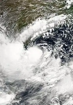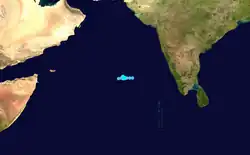 On October 27, a westward-moving disturbed area of weather formed about 885 nm east of Cape Guardafui, Somalia was designated Depression ARB 02/2007 by the IMD.[69] The next day, the Joint Typhoon Warning Center designated the depression as Tropical Cyclone 05A.[70] Soon after, the IMD upgraded the depression to a deep depression.[69] The Deep Depression did not develop and degenerated into a low pressure area on November 2 as it moved further west.[71][72][73] Agathi in Laskwadeep Islands received 70 mm of rainfall on 29 October.[12]