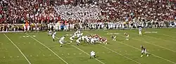 On July 19, a preseason poll voted on by members of the media that cover the Big 12 was released. The Sooners were chosen to finish second in the Big 12 South behind Texas. They finished nine votes behind the Longhorns but 44 points above Texas A&M, the third team.[1] This poll was released in anticipation of the Big 12 media day which began on July 23, 2007. Most publications had the Sooners ranked between five and ten in the preseason.[2][3][4][5] Phil Steele's self-titled publication, which is considered by many to be the most accurate college football preseason prediction magazine,[6] had the Sooners ranked number three in terms of how they would finish the year and how strong the team is going into the year.[7] On August 2, 2007, Coach Bob Stoops announced at a rally that the names of players would be put back on the team's jerseys. They had been removed in a re-design before the 2006 season.[8]