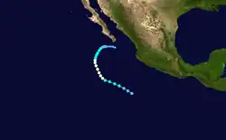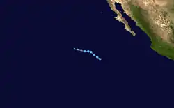 On May 24, a tropical wave emerged off the western coast of Africa. The wave entered the eastern Pacific around June 6 and shower and thunderstorm activity began to increase shortly thereafter. A broad area of low pressure formed a few hundred miles south of Acapulco, Mexico two days later.[19] Following satellite evidence of a well-defined circulation and organized convective activity,[20] the National Hurricane Center upgraded the disturbance to a tropical depression at 1200 UTC on June 11. After attaining winds of 35 mph (56 km/h) and a minimum barometric pressure of 1004 mbar (1004 hPa; 29.6 inHg), the depression began to traverse cooler waters and much more stable air. This caused all associated convection to fade away, and the depression degenerated to a non-convective remnant low at 0000 UTC on June 13. The remnant low continued northwest until dissipation by 0600 UTC on June 15.[19]