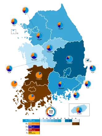 | South Gyeongsang | 843,662 | 55.0 | 189,463 | 12.4 | 329,486 | 21.5 | 73,893 | 4.8 | 82,645 | 5.4 |