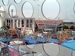 The Godzillatron scoreboard at Darrell K Royal-Texas Memorial Stadium, home of the Longhorns, with the Austin skyline in the background (2006).