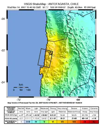 The 2007 Tocopilla earthquake occurred on November 14 at 12:40:50 local time. Its epicenter was located between Quillagua and Tocopilla, affecting the Tarapacá and the Antofagasta regions in northern Chile. The earthquake had a moment magnitude of 7.7 and lasted about 3 minutes and 35 seconds.[4] Seventeen aftershocks of magnitude greater than 5.3, including one of magnitude 7.1 and two others of magnitude 6.3 or higher, were recorded.[5] The Pacific Tsunami Warning Center issued a tsunami warning, stating a tsunami had been generated; after one hour, this warning was cancelled.[6][7] The earthquake was felt from Santiago, 1,245 km south from the epicenter, to La Paz, about 700 km north-northeast.[8]
