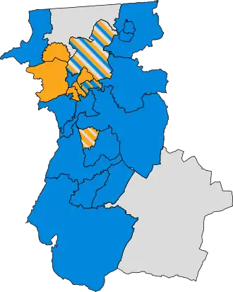 | Party | Seats | Gains | Losses | Net gain/loss | Seats % | Votes % | Votes | +/− | |