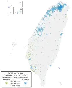 Presidential elections were held in Taiwan on 22 March 2008.[1][2] Kuomintang (KMT) nominee Ma Ying-jeou won with 58% of the vote, ending eight years of Democratic Progressive Party (DPP) rule. Along with the 2008 legislative election, Ma's landslide victory brought the Kuomintang back to power in the Republic of China.[3][4]