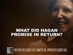 - ^ Kraushaar, Josh. Hagan's campaign says the ad sought to put inflammatory words in their candidate's mouth; The Dole campaign says the ad correctly shows who Hagan will associate with in order to raise campaign funds.Dole still keeping the faith. Politico. October 29, 2008.