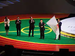 HK squash player Rebecca Chiu carried out the East Asian games flag onto the stage. She passed it to Timothy Fok, who then passed it to Tsang Tak-sing and finally to Tianjin mayor Huang Xingguo who is scheduled to host the 2013 East Asian Games. He then handed the flag to Liu Feng-shan (劉鳳山), secretary of the next East Asian Games organising committee. The flag was then wrapped up by members of the Hong Kong police. A "Meet Tianjin" (2013相約天津) video is broadcast. Tianjin, the city, was introduced.[3]