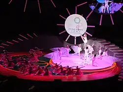 A group of stage dancers from Tianjin began the performance art section on stage. This was split into three sections. First was the Color segment which contained elements of Beijing opera. It was performed by 30 artists including famous opera actor Meng Guanglu. The Flower segment featured dancers performing a number of moves. The angels represent the mascot of the next East Asian Games. The Ocean segment had the dancers dressed in the color of water. They danced on stage and finished this section.[3]