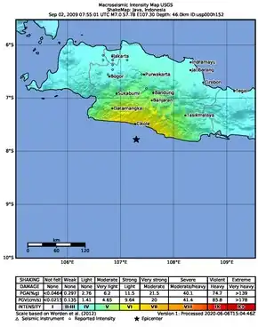 An earthquake occurred on September 2, 2009, at 14:55:01 local time in West Java, Indonesia.[1] The magnitude 7.0 earthquake killed at least 81 people, injured over 1,297, and displaced over 210,000 (including more than 140,000 in Tasikmalaya regency).[2][3] The quake was felt in the capital Jakarta, although damage there was minimal, and it was Indonesia's deadliest earthquake since the 2006 Pangandaran earthquake and tsunami.[4]