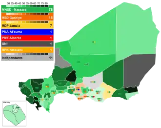 The turnout for the elections was 51.27% of the six million registered voters.[18] According to official results announced by CENI President Moumouni Hamidou on 24 October the governing MNSD won the elections by taking 76 of 113 seats in the National Assembly.[19] The MNSD had held 47 seats in the previous assembly.[18] Five parties considered allied to the MNSD won 25 seats: 15 for the Social Democratic Rally (RSD), seven for the Rally for Democracy and Progress (RDP), one for the Rally of Nigerien Patriots (a party founded in June 2009 by a former cabinet minister),[20] one for the Party of the Masses for Labour,[21] one for the Union of Independent Nigeriens (Union des Nigériens Indépendants) and one for the Nigerien Self-Management Party.[18] The RSD increased its number of seats by eight from the previous elections in 2004, whilst the RDP gained an extra seat.[18] Eleven independent candidates won the remaining seats, marking first time that independents have won seats in the assembly.[19] The Constitutional Court had 15 days to validate the elections from the date of the announcement of the results.[18]