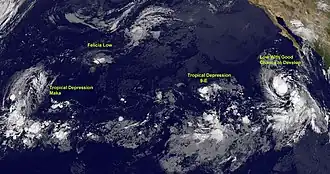 Tropical Storm Enrique developed out of a broad area of low pressure several hundred miles south-southwest of Baja California Sur. The center of circulation was embedded within a central dense overcast and located within an area favoring further development. The depression tracked just north of due west in response to a mid-tropospheric ridge north of the system. Upon becoming a tropical cyclone, a second area of low pressure, that would later become Hurricane Felicia located nine degrees of longitude to the west, had the possibility to develop into a tropical depression and possibly influence the system.[41] Late on August 3, the depression intensified to a tropical storm and was given the name Enrique. Enrique strengthened to reach a peak intensity of 65 mph (105 km/h) on August 4. However, interaction with Hurricane Felicia weakened the system late that evening, with maximum winds decreasing to 50 mph. Enrique maintained winds of 50 mph (80 km/h) for the next day or so, until early on August 6, when the NHC downgraded Enrique to depression status. On August 7, the NHC issued their final advisory on Enrique as the system degenerated into a remnant low.[42]