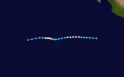 The season was characterized as "near-normal",[7] featuring 17 named storms 8 hurricanes and 5 major hurricanes. The central Pacific experienced above-average activity with three additional storms forming west of 140°W and three more crossing over from the eastern Pacific.[4][8] The overall number of storms contrasted to a relative lull in activity experienced over the previous decade. During the course of the year, large-scale factors such as an El Niño and two Madden–Julian oscillations greatly contributed to the changed pattern.[9] The season's activity, east of 140°W, was reflected with a near-average cumulative accumulated cyclone energy (ACE) rating of 100, roughly 94% of the 30-year median.[8][10] ACE is, broadly speaking, a measure of the power of the hurricane multiplied by the length of time it existed, so storms that last a long time, as well as particularly strong hurricanes, have high ACEs. ACE is only calculated for full advisories on tropical systems at or exceeding 34 kn (39 mph; 63 km/h) or tropical storm strength.[10]