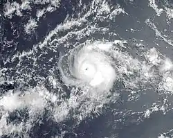 A tropical wave departed the west coast of Africa on June 25, which moved across the Atlantic without development. The wave entered the eastern Pacific on July 4, later developing more convection on July 8 to the south of Mexico. Early on July 10, convective banding features developed along the periphery of the system[36] and an area of low pressure developed within the wave.[37] On July 10, the NHC designated the system as Tropical Depression Four-E about 900 mi (1,400 km) south of the southern tip of the Baja California Peninsula. Soon after, it strengthened into Tropical Storm Carlos while moving westward through an area of warm waters and light wind shear. On July 11, Carlos intensified further into a minimal hurricane. At that time, the small storm developed a small eye-like feature, which had disappeared the next day, causing Carlos to weaken back into a tropical storm. The eye feature redeveloped, signaling that Carlos reintensified into a hurricane on July 14, reaching peak winds of 105 mph (169 km/h) early the next day. Located at 10.1ºN, this made Carlos the southernmost Category 2 hurricane in the eastern Pacific proper. Late on July 15, the hurricane encountered strong wind shear, resulting in rapid weakening. About 24 hours after its peak intensity, Carlos deteriorated into a tropical depression, and dissipated early on July 17 well to the southeast of Hawaii.[36]