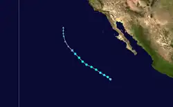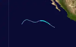 A tropical wave exited the western coast of Africa on June 19, which moved westward across the Atlantic without development. By June 29, the wave crossed Central America into the eastern Pacific. Thunderstorms increased over the next several days, which organized into curved rainbands around a developing low-pressure area on July 4. Following further organization, the system developed into a tropical depression on July 6, located roughly 435 miles (700 kilometres) south of Cabo San Lucas, Mexico. Soon after, it strengthened into Tropical Storm Blanca.[25] Operationally, the NHC classified the system immediately as a tropical storm. At that time, Blanca developed an eye-feature, though it was not expected to develop into a hurricane.[26] Steered by a ridge to the north, the storm moved west-northwestward throughout its existence.[25] Early on July 7, Blanca attained peak winds of 50 mph (80 km/h) and a barometric pressure of 998 mbar (hPa; 29.47 inHg).[25] The storm's convection developed into a central dense overcast over the center,[27] which soon began deteriorating, with cloud tops warming and convection shrinking.[28] By late on July 7, the center became devoid of shower and thunderstorm activity,[29] with only intermittent convection.[30] On July 8, Blanca weakened into a tropical depression, and the next day it degenerated into a remnant low. Although no longer a tropical cyclone, the remnants of Blanca maintained a well-defined low pressure center as it continued its northwesterly movement. Early on July 11, the system turned northward and gradually weakened. By the following day, Blanca had dissipated over open waters.[25]