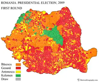 Presidential elections were held in Romania in 2009. They were the sixth presidential elections held in post-1989 Romania. The first round took place on 22 November, with a run-off round between the top two candidates Traian Băsescu (supported by the Democratic Liberal Party or PDL for short) and Mircea Geoană (supported by the Social Democratic Party or PSD for short) on 6 December 2009. Although most exit polls suggested a victory for Geoană in the runoff, the authorities declared Băsescu the narrow winner with 50.33% of the votes.[1][2] To date, it is the closest presidential election in the political history of Romania.