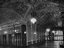 There is a groin vault above the intersection of the arcade and the elevator lobby, with black marble pilasters at each corner.[8] The elevator lobby is about 13 ft (4.0 m) wide, with similar floors to the arcade.[22] Turnstiles are installed in front of the elevator lobby, restricting access to tenants and guests.[24] The shallow barrel-vaulted ceiling contains a grid of rosettes within squares; the north and south edges of the ceiling contain gilded moldings, as well as friezes with peacocks.[8] Below the friezes, the north and south walls contain elevator doors, as well as brass mailboxes resting atop marble sills. There are four elevators to the north and six to the south;[22] their doors are made of brass, with vertically arranged motifs of arches and rosettes. Each set of elevator doors is surrounded by a black-marble frame.[8] The elevator lobby leads east to a double brass door, above which is a gilded lunette panel.[24]