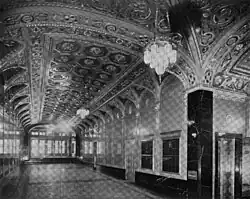 The main arcade contains a patterned terrazzo floor, made of yellow and pink tiles.[21] The tiles are rhombus-shaped and are laid in a chevron pattern.[22] The main section of the floor is surrounded by a patterned marble border made of dark yellow Siena, pink Verona, and Bois Jourdan marble. The outermost section of the floor is made of blue marble.[4] The side walls are also made of pink marble above a black baseboard. Each wall is separated at regular intervals by yellow-marble pilasters.[21] The capitals of each pilaster contain moldings of lion heads, which support round arches on the ceiling. Between these lions' heads are medallions that symbolize horses, sheep, and rams.[23] The eastern wall contains two tenant directories and two brass doors, to the north of the elevator hall. The center of the western wall (facing the elevator hall) includes a brass door to the freight loading dock, which is flanked by black-marble panels and topped by a lunette with birds. There is a reception desk in front of this door.[24] The barrel-vaulted ceiling is ornately decorated with circular and octagonal reliefs and medallions.[21]