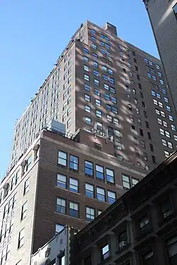 There is a setback on the eastern elevation above the ninth story, measuring 45 ft (14 m) deep. Behind this setback, the building tapers into a narrower tower.[9][10] This is because the eastern portion of the site was formerly zoned to allow only residential use, while the western portion could also accommodate commercial use. The offices were above the ninth story which occupied only the western part of the site.[11] The lowest nine stories (which occupied the whole site) were originally an apartment hotel.[11][12] The northern and southern elevations contain a setback above the eleventh or twelfth story.[13][14] The restriction on the Madison Avenue portion of the site expired in 1940.[15][16]