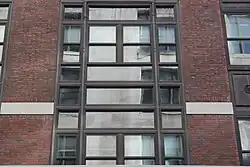 The upper stories contain a facade of red brick with limestone trim. The Madison Avenue elevation of the facade is made almost entirely of brick, except at several places where there is limestone trim. On the 35th and 36th Street elevations, only the outermost bays of windows are made of brick. The remaining bays are separated horizontally by brick piers; within each bay, the windows on different floors are separated horizontally by black spandrels. The spandrels on the second and third stories are made of ornamental ironwork, splitting each bay into multi-part windows. The spandrels on higher stories are made of dull black terracotta and divide each bay into three windows.[4] Robert A. M. Stern and the co-authors of his book New York 1930 wrote that the facades "hardly resulted in the 'Masterpiece of Modern Architecture' claimed by the Real Estate Record and Guide, but they responded sensitively to the residential scale and character of the Murray Hill district".[6]