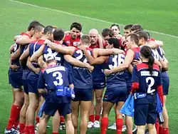 ![]() Melbourne huddle against Collingwood in round 12 | |
