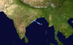 In early December, a low-pressure area formed over the Bay of Bengal. The low-pressure area moved towards the Indian coast and became more well marked. On December 7, the India Meteorological Department (IMD) upgraded the area of low pressure to a depression giving it the designation "BOB 06". At that time it was located approximately 450 kilometres (280 mi) south-southwest of Visakhapatnam, Andhra Pradesh, India.[73] Until December 8, the depression moved northwestwards and made landfall at Bapatla, Andhra Pradesh, India where it dissipated into a remnant low soon after the landfall.[74][75]