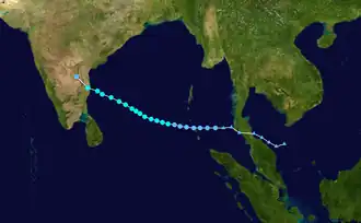 On October 12, a disturbance formed in the South China Sea, just off the eastern coast of Borneo. During the next few days, the system entered the border of the east Indian Ocean and intensified slightly.[52] As soon as the system entered the eastern border of the Bay of Bengal on November 1, the IMD immediately upgraded the disturbance into a depression, because the system had already organized itself on October 31, a day before the system entered the IMD's area of responsibility.[53] Later on November 1, the system began showing signs of further, but slow organization, as it continued moving west slowly.[54] on November 2, the Malaysian Meteorological Department (MMD) also issued their first advisory on the system, and simply called it Depression.[55] Later on that day, the IMD reported that the system had weakened into a low-pressure area, but they forecasted it to intensify into a depression soon again.[56] Late on November 3, the Joint Typhoon Warning Center (JTWC) issued a Tropical Cyclone Formation Alert on the system.[57] Early on November 4, the India Meteorological Department (IMD) upgraded the area of low pressure to a depression giving it the designation "BOB 05".[58] That day, the Joint Typhoon Warning Center (JTWC) designated the system as Tropical Cyclone 05B.[59] Early on November 5, the IMD upgraded Depression BOB 05 to a deep depression.[60] Later, the deep depression strengthened further, prompting the IMD to upgrade it to a cyclonic storm, and was named "Jal."[61] The storm continued to grow and became a severe cyclonic storm by November 6.[62] Soon afterwards, it was upgraded to a Category 1 Tropical Cyclone by the JTWC.[63] On November 7, Jal started weakening.[64] Soon afterwards, the IMD reported that Jal weakened into a Cyclonic Storm.[65] Later that day, the JTWC downgraded Jal into a Tropical storm.[66] Late on the same day, the IMD reported that the storm weakened into a Deep Depression.[67] As a deep depression, the system made landfall at Chennai, a few hours later.[68] The system continued to weaken and became a depression by early hours of November 8.[69] The depression continued to weaken until it dissipated into a remnant low on the same day.[70] On that very same day the IMD said that there was a possibility of Jal's remnants regenerating over the north east Arabian Sea.[71] As predicted, the system moved into the Arabian Sea without weakening by early November 9.[72] However, instead of crossing the Arabian Sea, the system moved north along the western coast of India, restrengthening slightly, but not enough for it to regenerate completely. Within a few hours, the storm started moving inland, due to the prevailing winds. The system rapidly weakened as it moved farther inland over the next few days, causing severe flooding along the way. Early on November 12, the remnants of Cyclone Jal were completely absorbed by a non-tropical low over the Himalayas.